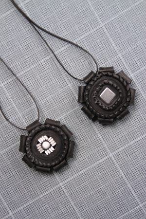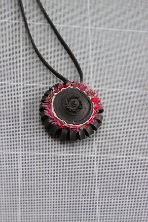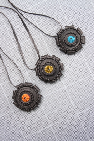 Ces médaillons constituent une sorte d'aboutissement de mon travail. J'y combine enroulements, torsions, emboîtements, découpages et ajourages. J'y intègre métal, tissu, perles... Il en résulte des pièces à l'aspect surprenant, voire précieux. | ||||||||||||||||||||||||||||||||